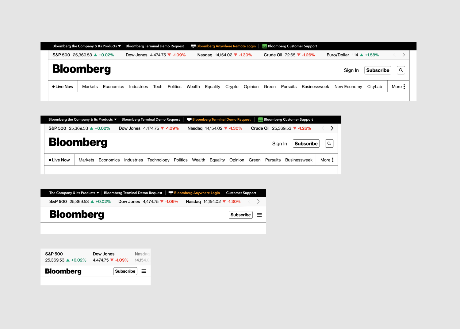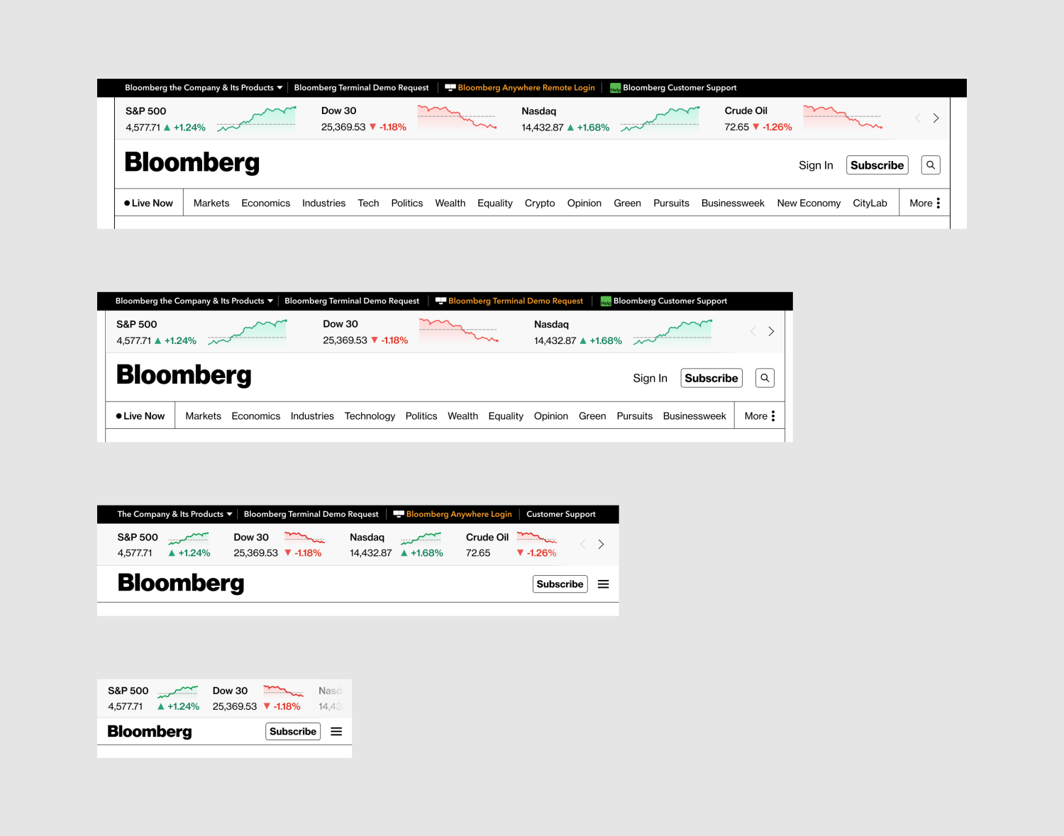 In 2022 I worked at Bloomberg News. One of the projects I worked on was redesigning the stock ticker at the top of the website’s homepage. During that process I came across Edward Tufte’s sparklines, which influenced some of the sketches but did not make it into the final ticker.