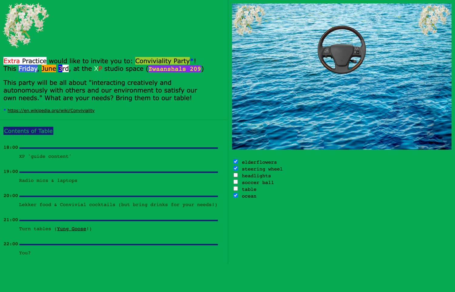 A web invitation for a Conviviality Party at Extra Practice.