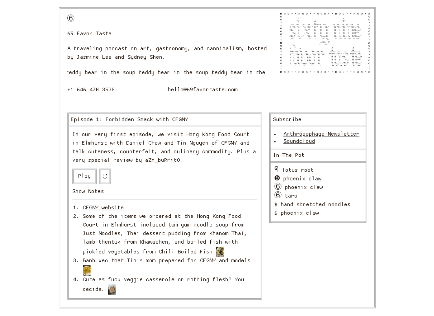 Design and development of a website for 69 Favor Taste, a traveling podcast on art and gastronomy hosted by Jasmine Lee and Sydney Shen.