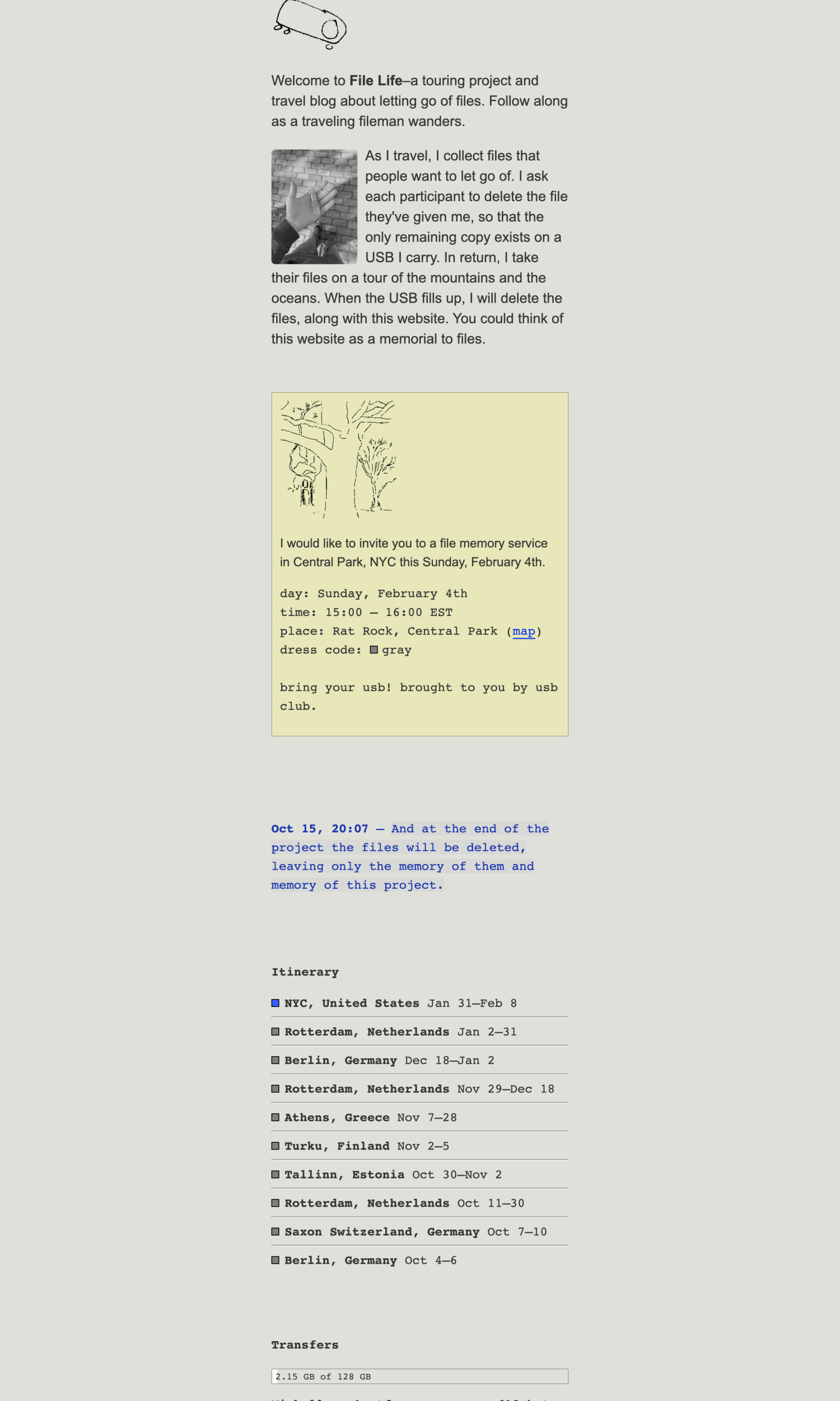 File Life is a touring project and travel blog about letting go of files. As I travel, I collect files that people want to let go of. I ask each participant to delete the file they've given me, so that the only remaining copy exists on a USB I carry. In return, I take their files on a tour of the mountains and the oceans. When the USB fills up, I will delete the files. You could think of the website as a memorial to files. The file life website's original url was filelife.tours (which no longer exists). It is now hosted at here. File Life was supported by USB Club.