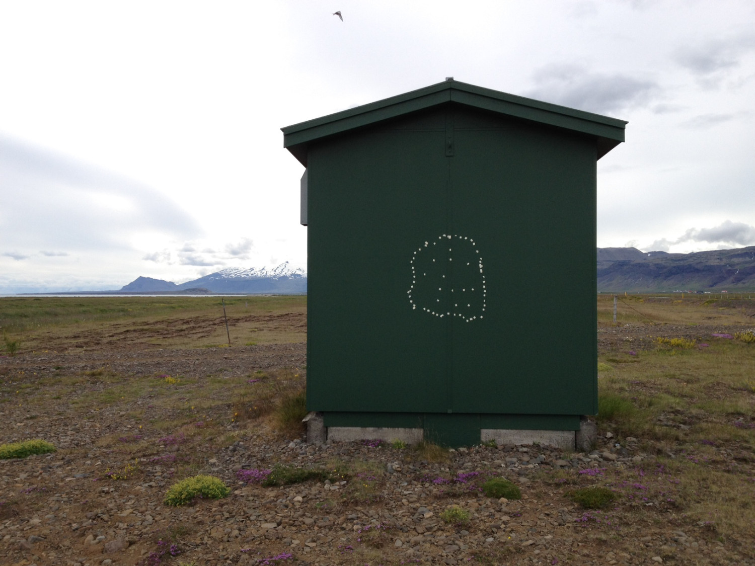 In 2013, I traveled to Iceland with a painting class and during my daily walks, I passed by a green utility shed. Even from the farm where I was staying, I could still see the shed in the distance, but it appeared as a mere dot on the horizon. I created a foil piece to temporarily adhere to the shed, and later removed it a year later. The tape marks left behind a constellation of dots.