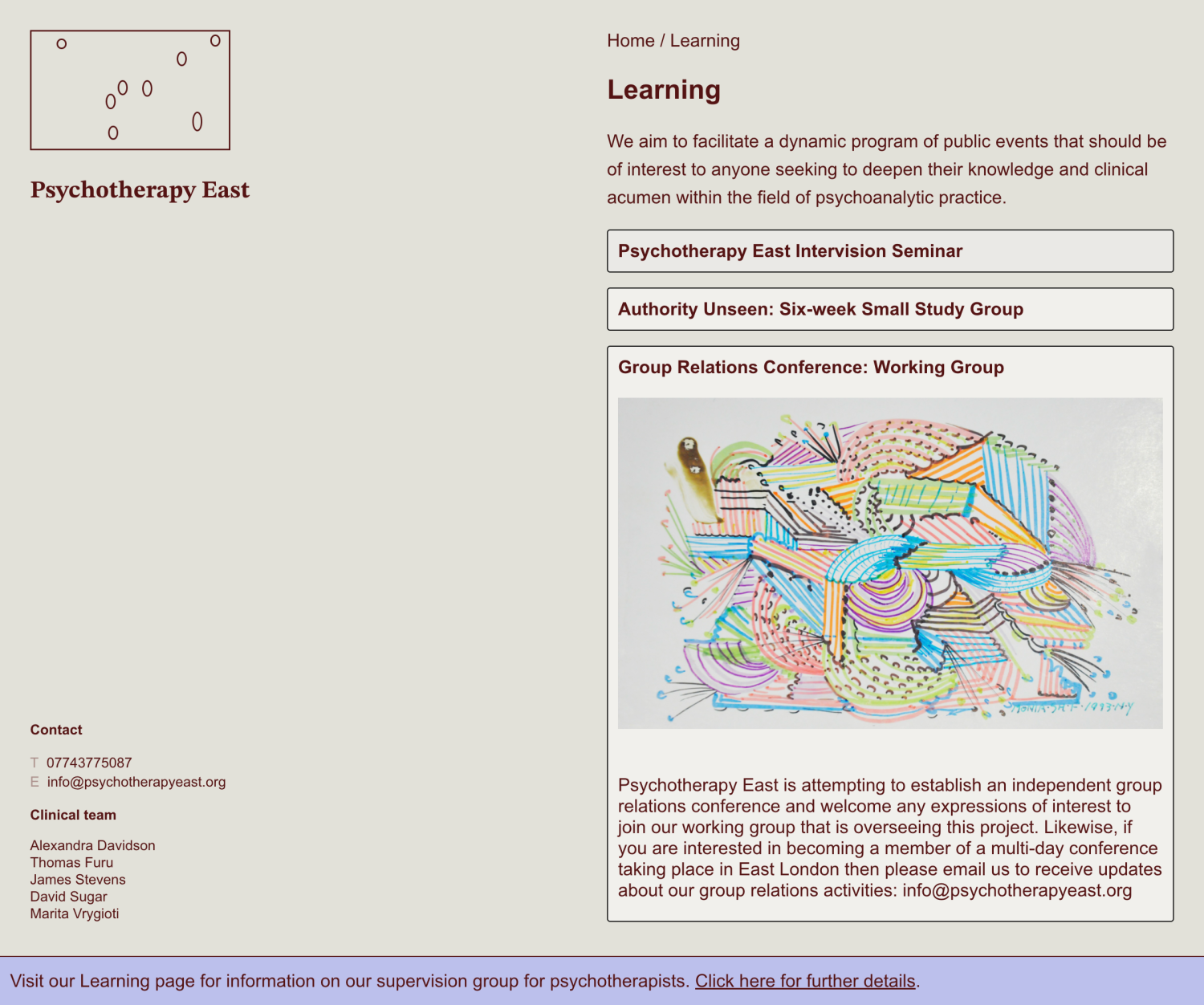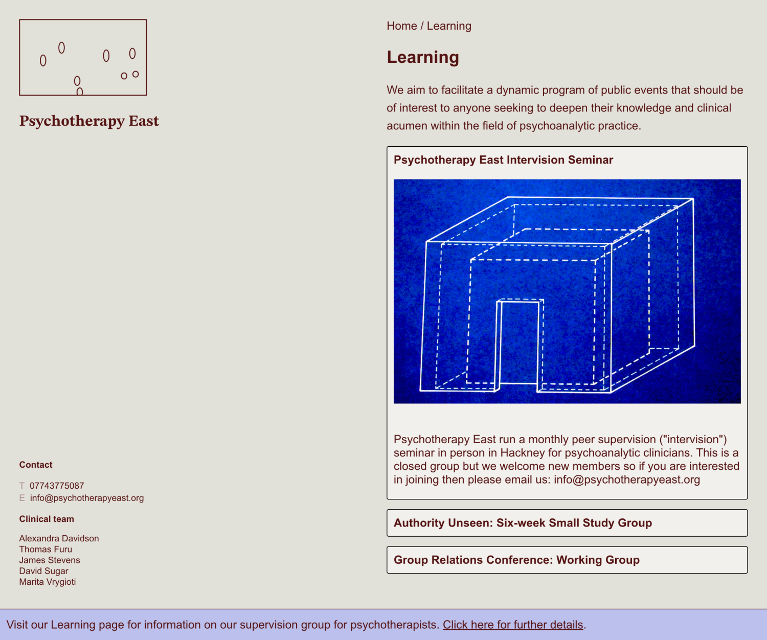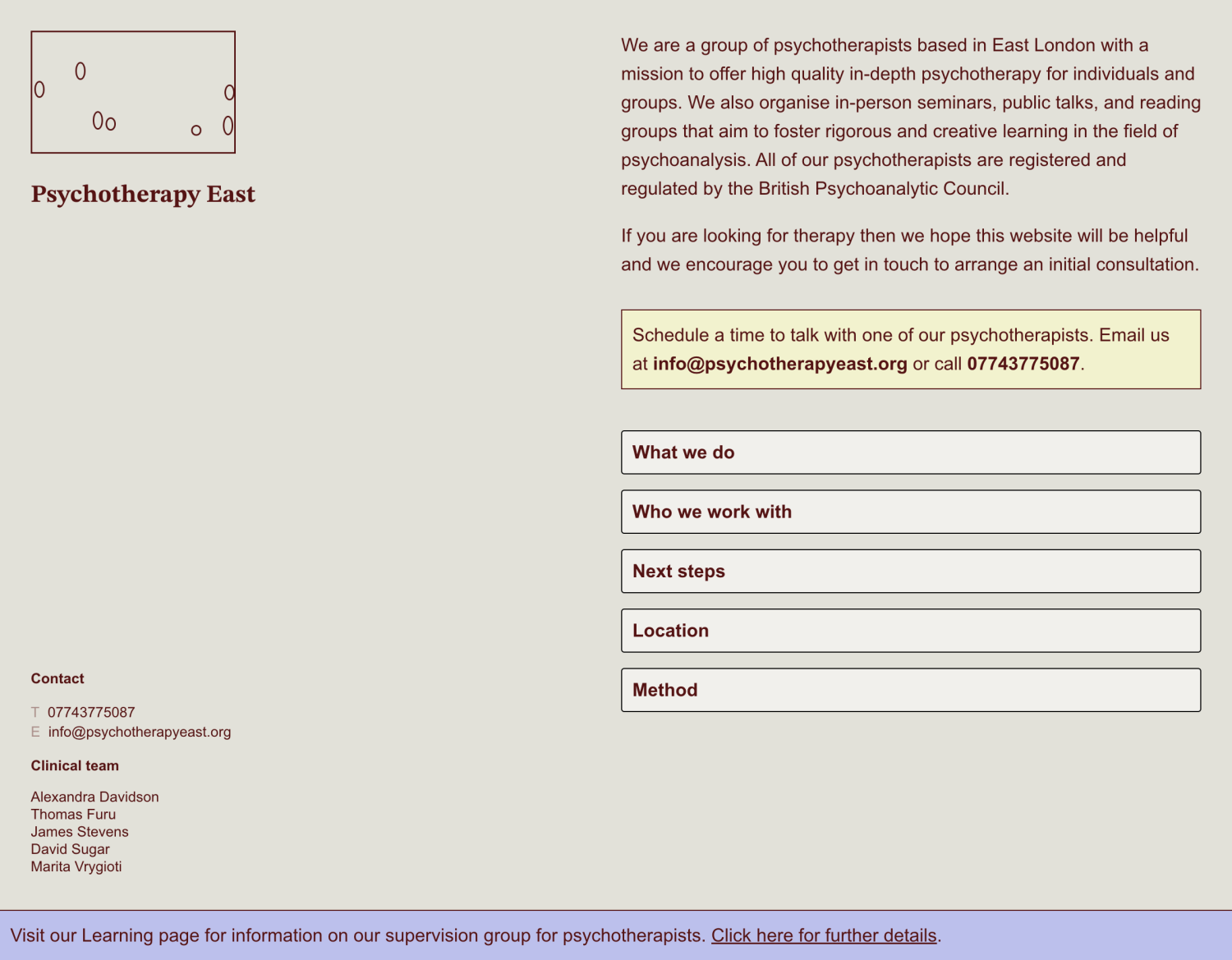 Psychotherapy East is a group of psychotherapists based in East London with a mission to offer high quality in-depth psychotherapy for individuals and groups. The site was designed to be direct and accessible with expandable sections for more information.