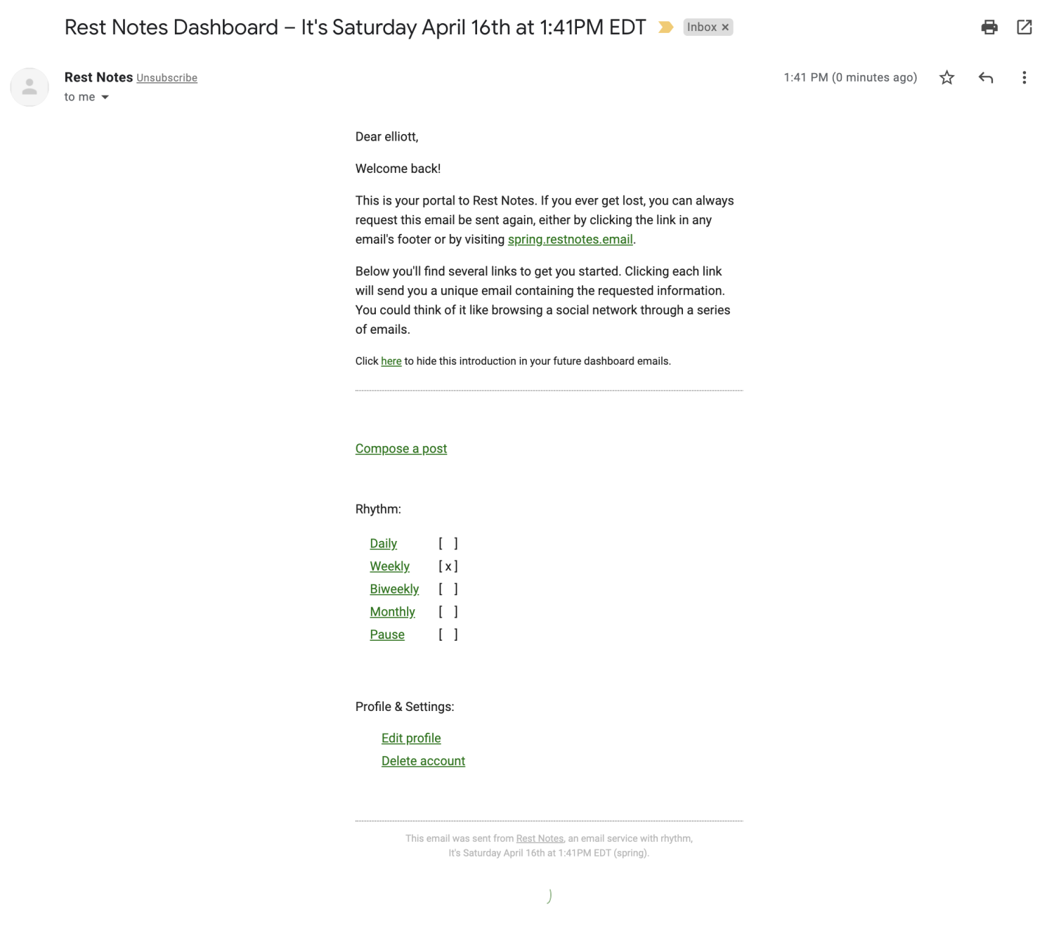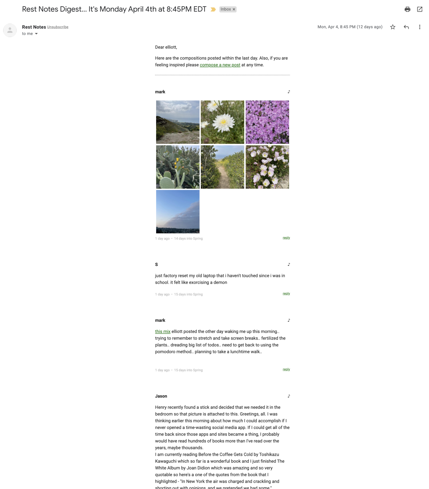 Rest Notes is a community email network with rhythm. This project is a collaboration with Mark Beasley.