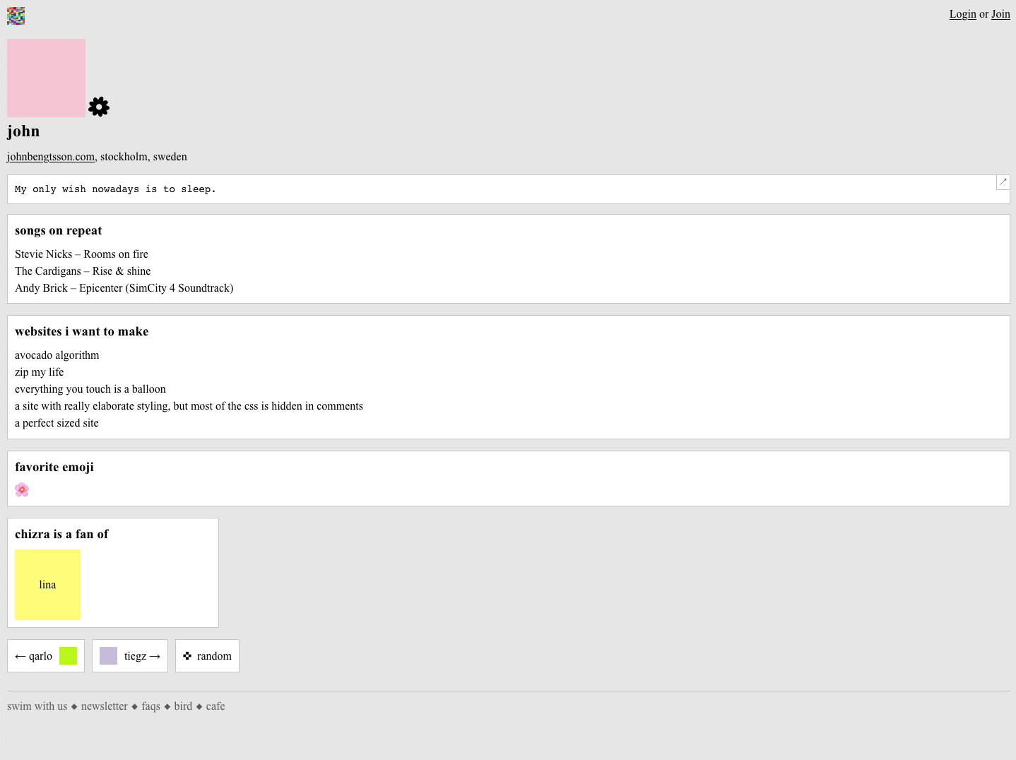 Special Fish is a directory of profiles. Each profile is composed of a text-based log, lists, and links.