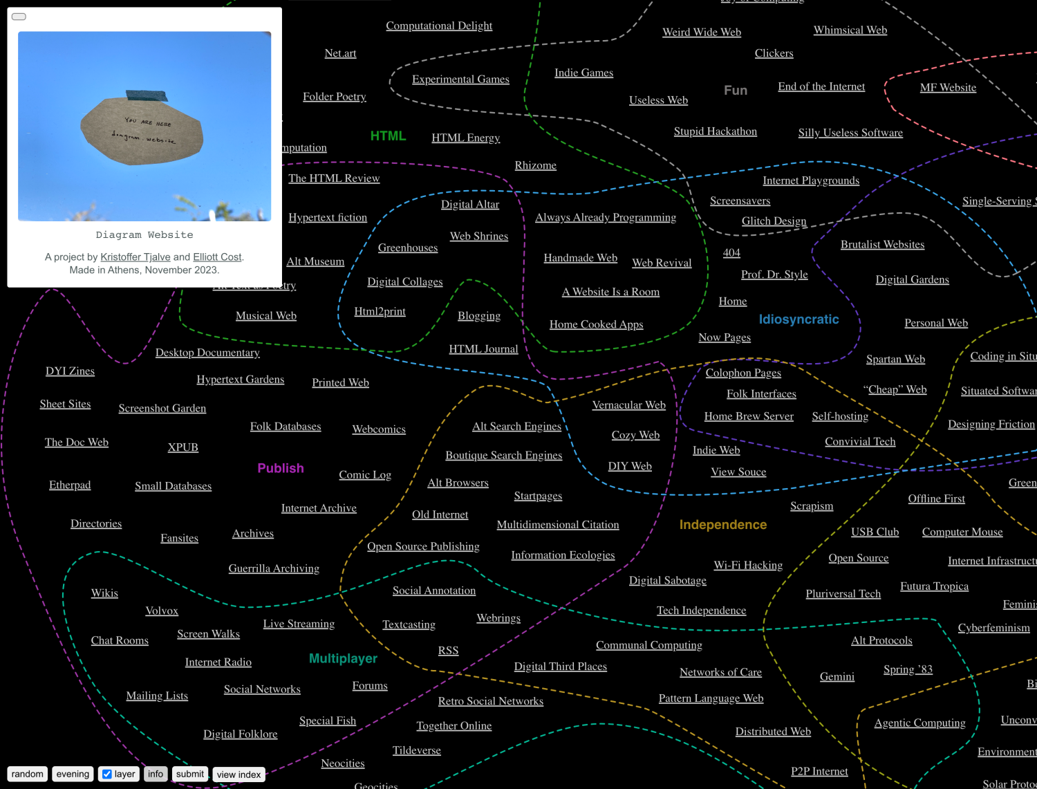 "I made a map of the Internet. It is incomplete. You won’t find links to social media sites, big corporations or advertisement renderings. In fact, most of the Internet is missing from the map. Hence, it is more accurate to describe the map as My Internet or the Naive Internet Universe." – Kristoffer Tjalve