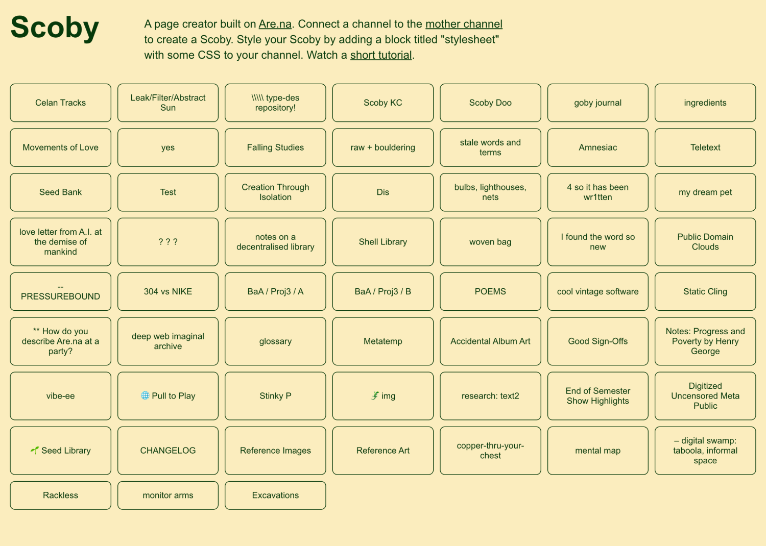 A website builder built on Are.na. Some of the following images are websites by Are.na users built using Scoby.